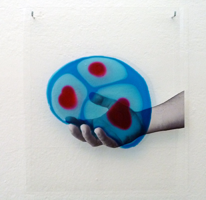 Ralf hält blaue Form mit roten Flecken, 2013, Acryl, Foto, Plexiglas, 40 cm x 35 cm